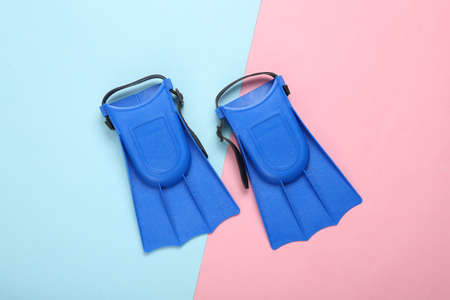 Children's fins on blue pink pastel background. Travel concept, vacation at sea. minimalist photo. Flat lay, top view