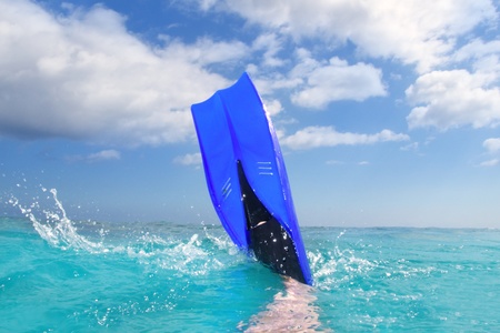 Diving blue fin splashing in Caribbean surface vacation metaphor