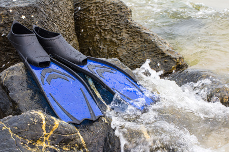 Pair of blue rubber fins or flippers on the seashore lying alongside a rock at the edge of the ocean ready to go swimming or skin diving