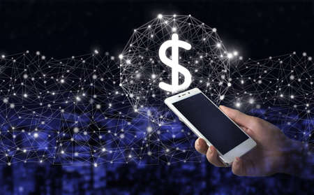 Business ideas, currency exchange, and global stock market analysis. Hand hold white smartphone with digital hologram dollar sign on city dark blurred background