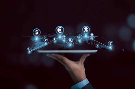 Businessman hand holding tablet with virtual world map connection line and global currency , Technology transfer money and Currency exchange concept.