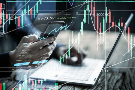 Abstract creative financial graph and hand with phone on background, forex and investment concept. Multiexposure