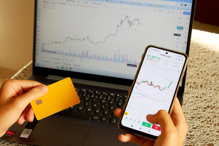 An investor who buys coins with a credit card. bitcoin chart on computer in background.