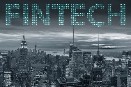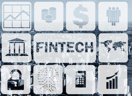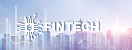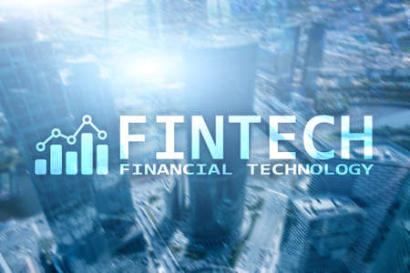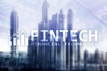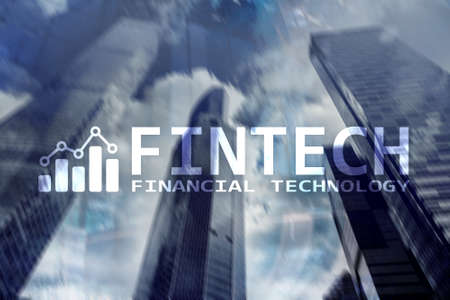 FINTECH - Financial technology, global business and information Internet communication technology. Skyscrapers background. Hi-tech business concept.