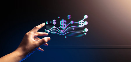 hand of businessman interactive touching a holographic of transaction financial network data system and dollar icon, concept of technology artificial intelligence with human user