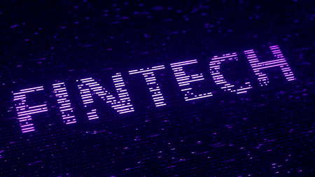 Purple FINTECH word made with flying luminescent particles. Loopable 3D rendering