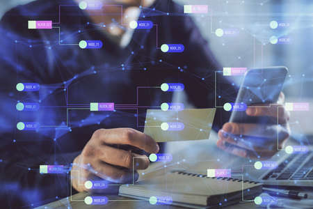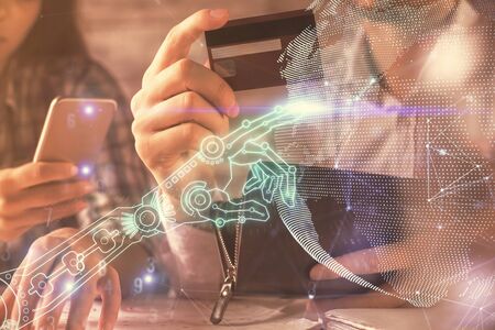 Double exposure of man and woman on-line shopping holding a credit card and tech theme hologram drawing. Technology concept.