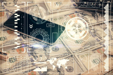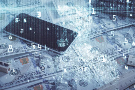 Double exposure of data theme drawing over us dollars bill background. Technology concept.