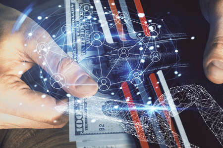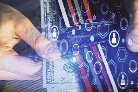 Multi exposure of social network theme drawing hologram and USA dollars bills and man hands.