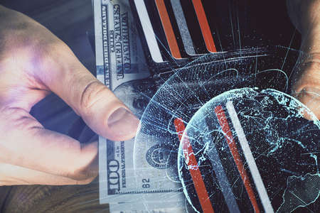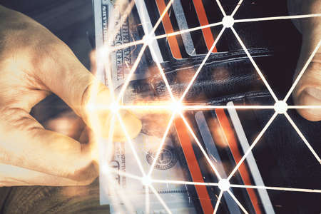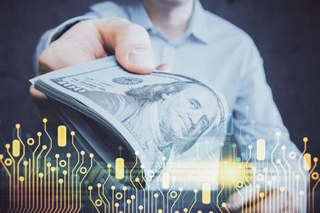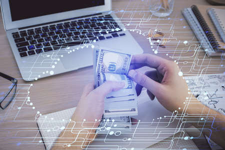 Multi exposure of Tech drawing hologram and USA dollars bills and man hands. Technology concept.