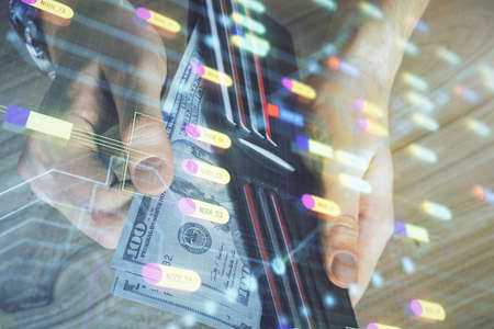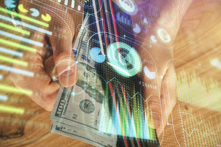 Double exposure of forex graph drawing over us dollars bill background. Concept of financial markets.