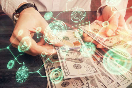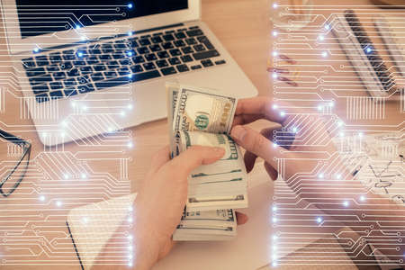 Multi exposure of technology drawing hologram and us dollars bills and man hands. Data concept