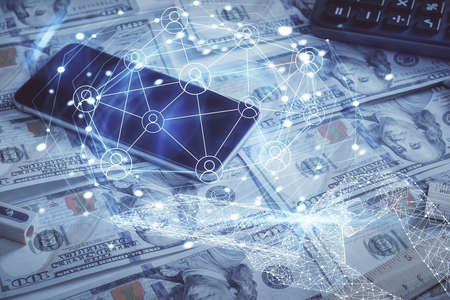 Multi exposure of social network drawing over us dollars bill background. Concept of people connection.