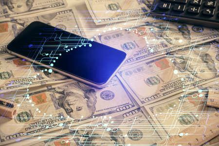 Double exposure of creative USD symbols hologram and hand with cell phone on background. Banking and investing concept