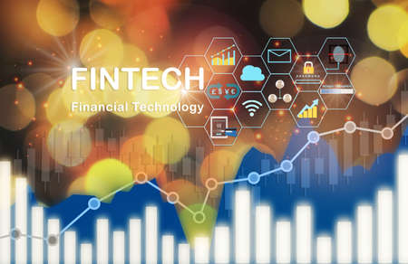 Financial technology or fintech icon on abstract bokeh background. Investment trading with technology concept and growth graph with double exposure idea