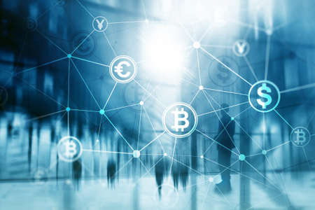 ICO - Initial coin offering, Blockchain and cryptocurrency concept on blurred business building background.