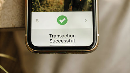 Mobile payment confirmation screen with successful transaction message.