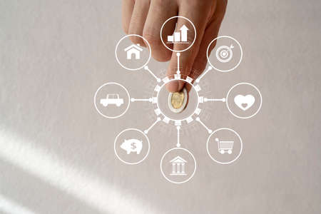 Online banking concept with futuristic design and graphics over hands. Financial icons as a projection of the image