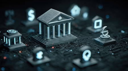 A captivating digital banking scene featuring a classical bank structure surrounded by cryptocurrency symbols, representing modern finance and technology integration.