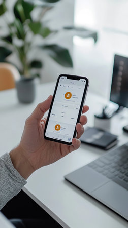 Person checking cryptocurrency balance on smartphone while working at desk