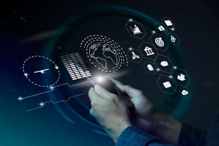 Businessman touches virtual screen technology to do online transactions via internet Connect data to the world. concept of global data connection by internet technology, big data system.