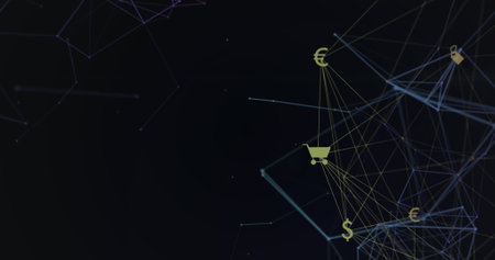 Weaving purple lines linking nodes in ecommerce network, with delivery truck and box icons. Technology, digital, futuristic, connectivity, data, cyber, network