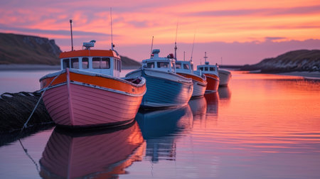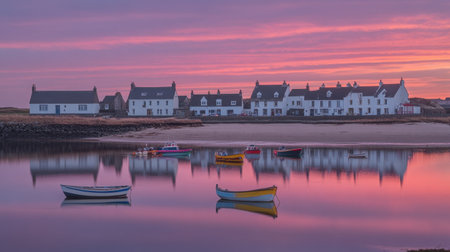 A tranquil coastal village at dusk showcases colorful boats anchored in still waters, reflecting the vibrant sky. The peaceful scene invites relaxation.