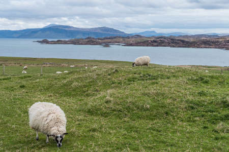 Sheep and picturesque view of pastures and sea, Rodel, Outer Hebrides, Scotland
