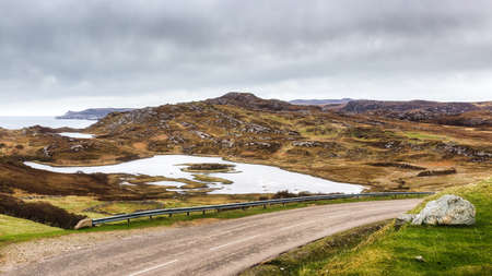 Assynt Peninsula, Scotland - June 7, 2012: Altandhu hamlet on Atlantic Ocean inlet shore with multitude of rocky islets under heavy storm sky. Mountain peaks in background.