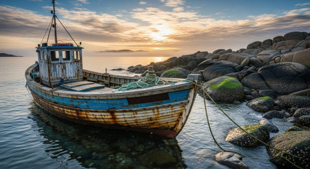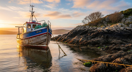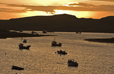 Boats at sunset in a lonely bay of Connemara, Ireland
