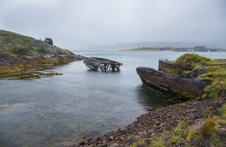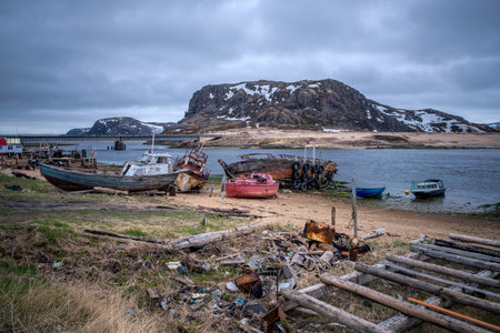 Abandoned ships cemetery at low tide near Teriberka village in Murmansk Region. Kola peninsula, Northern Russia
