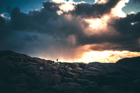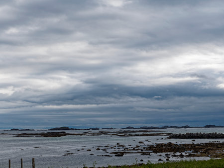 Rocky seashore with cloudy sky. Wilderness. Beautiful nature of Norway. Lofoten islands