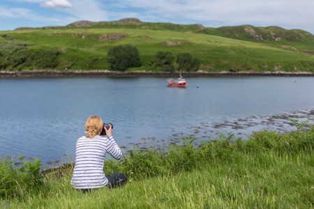Silhouetted dinghy boat on Loch Dunvegan in Scotland.