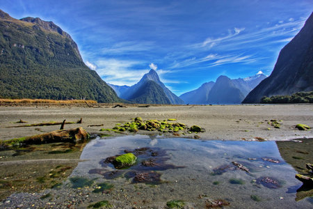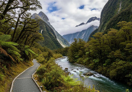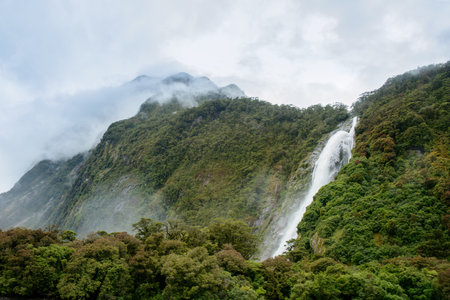 A stunning scene of the green nature and ford land at Milford Sound, New Zealand