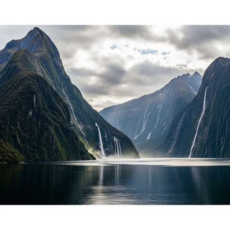 A serene landscape of majestic mountains and waterfalls cascading into a calm lake under a cloudy sky