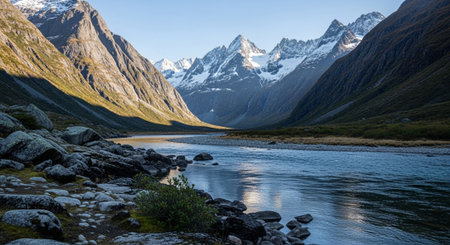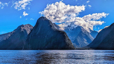 A stunning scene of nature with snow mountain and ford land at Milford Sound, New Zealand.