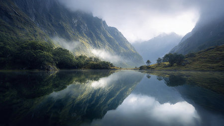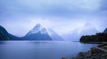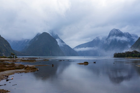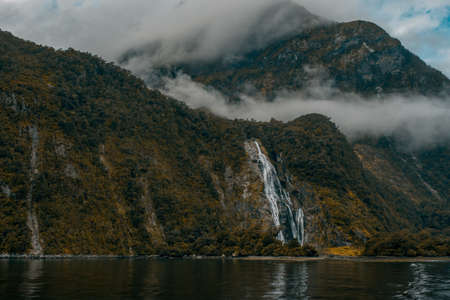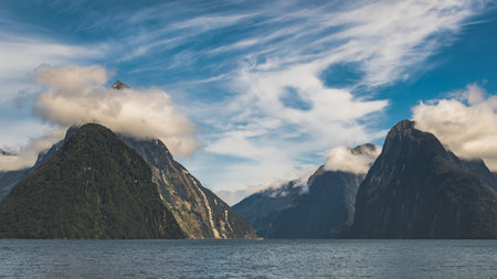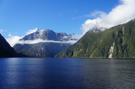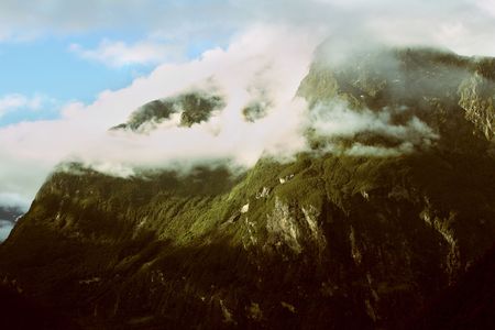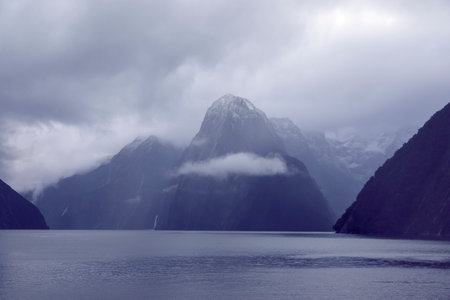 Clouds hanging over the mountains in Milford Sound New Zealand