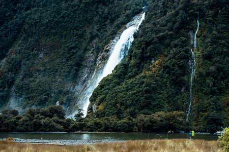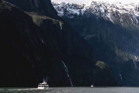 A stunning scene when a ferry cruising to a waterfall at Milford Sound, New Zealand.