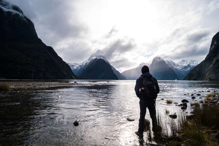 A backpacker man with jacket and beanie enjoying with the stunning scenery of the ford land at Milford Sound, New Zealand