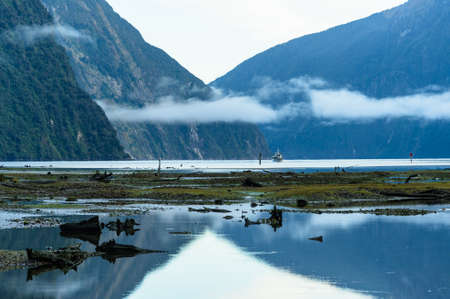 Photograph looking into Milford Sound on a cloudy and rainy day from the boat harbour in Fiordland National Park on the South Island of New Zealand