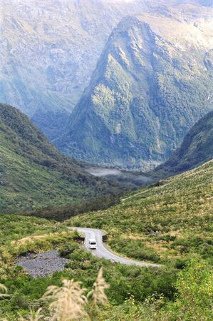Mountain road up hill in the forest, nature landscape. Shot at Milford Road, State Highway 94 in New Zealand. Transportation and tourism road trip concept.