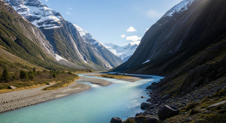 Panorama view of upper Waimakariri Valley and braided Waimakariri River in Arthur’s Pass National Park, Canterbury, South Island.