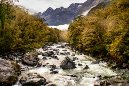 Tutoko River rapids in the mountains alongside Milford Sound Highway in moody rain and low cloud and rain