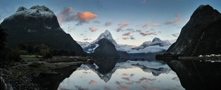 Milford Sound, Fjordland National Park, South Island, New Zealand, Oceania. Panoramic view of the mountains in the Fjordland National Park, Milford Sound.