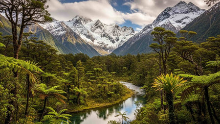 Splendid image of the SH94 road towards Milford Sound surrounded by greenery with snow capped mountains in the background taken on a sunny winter day, New Zealand