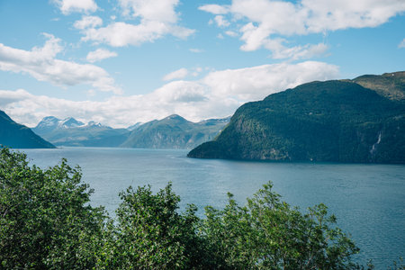 Tourism vacation and travel. Mountains landscape and fjord in Norway Scandinavia Europe. Norddalsfjorden as seen from ferry. Beautiful nature