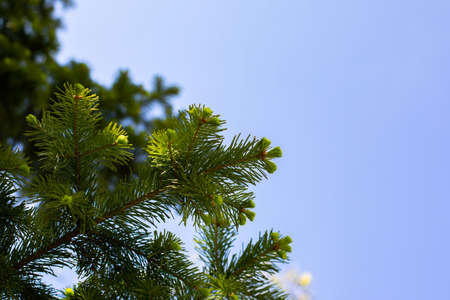 Spruce or fir tree young branches in the wood. Blooming spruce in spring, close-up.