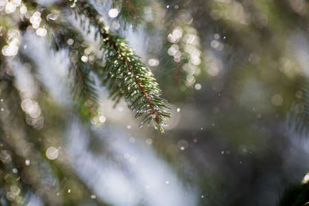 Spring, nature wallpaper. Young spruce branch close-up. Raindrops sparkle on the pine needles in the sun. A tree or bush. Blurred background.