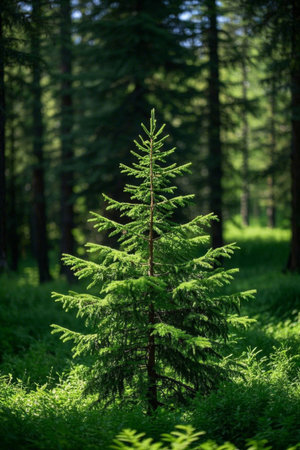 A close-up view of a green spruce branch amidst lush forest scenery, capturing the essence of tranquility in nature under soft natural light with blurred trees.