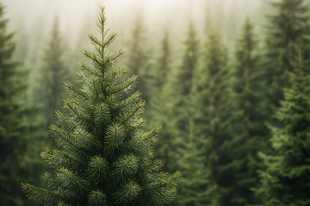 Evergreen trees stand tall in a tranquil forest wrapped in gentle morning mist creating a peaceful scene perfect for New Year reflections.